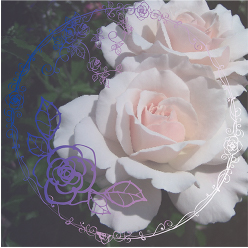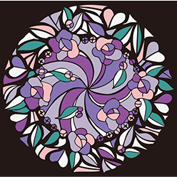 ステンドグラス風のデザインに、さりげなく散りばめられたハートとバラが優雅なアクセント。パープルのグラデーションカラーが美しい。