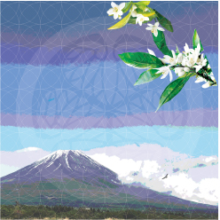 家康公が愛した静岡を傘に込めました。徳川家の家紋である三つ葉葵をはじめ、手植え蜜柑、徳川家康が愛したものとの説がある一富士二鷹三茄子を配し、背景には青空をイメージした青が美しいデザインです。