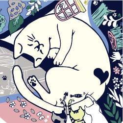 お昼寝中の猫が夢の中で大冒険しているという、物語のあるデザインです。よく見ると仲間同士でお魚を取り合っています。
