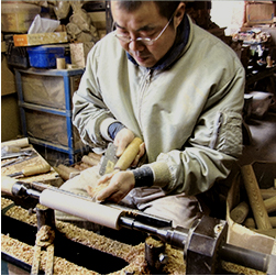 挽物(ひきもの)とは、轆轤などを使用して刃物で木を加工した製品のことを指します。昔から木製の玩具や胡椒引きなど、丸みのある木製品のほとんどに挽物の手法が用いられています。基本的な手引き技術による生産は減少傾向にありますが、現在ではデザイナーとのコラボレーションやインテリア製品を制作するなど、生活スタイルに合わせた製品を世に送り出しています。