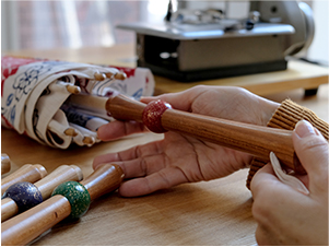 一針一針丁寧に縫いつけ、心を込めて仕上げていきます。傘をより美しく見せる細やかなパーツも丁寧に作ります。
